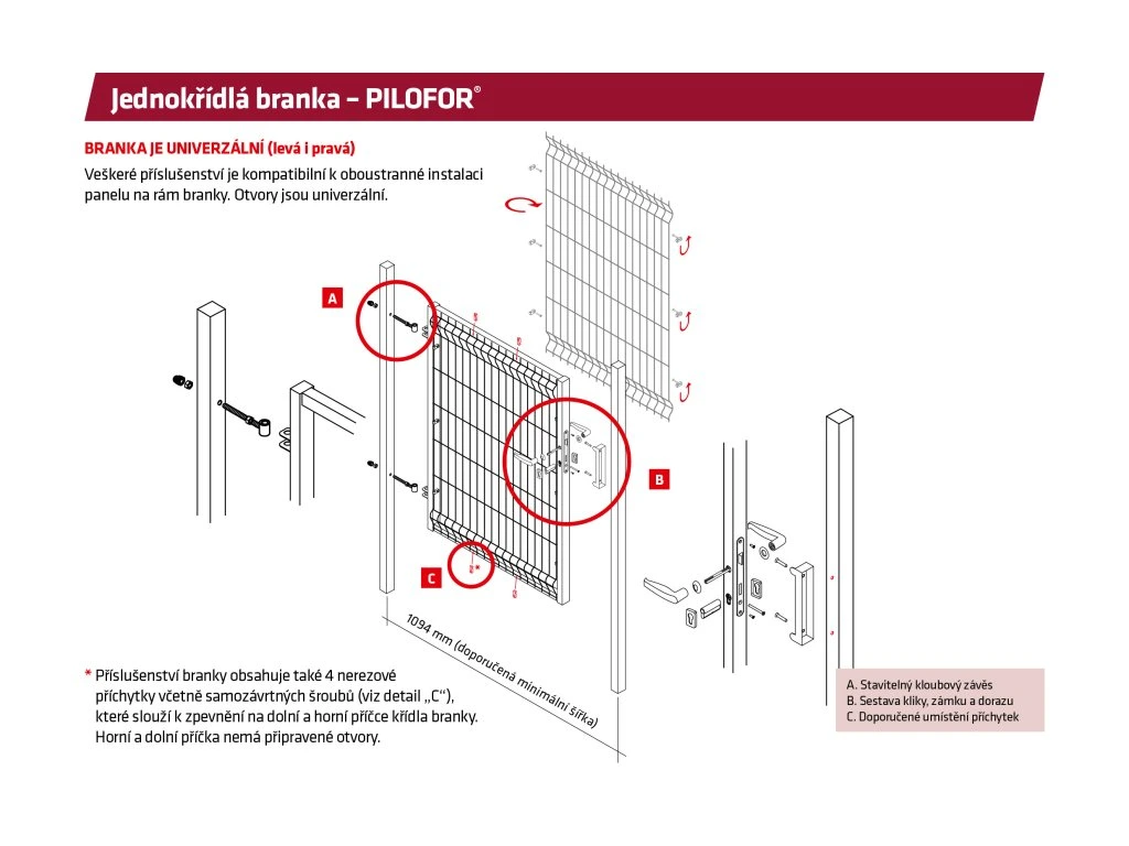 Jednokřídlá vchodová branka PILOFOR je vyrobená z pozinkovaného materiálu a slouží pro spolehlivý průchod plotů rodinných domů, chalup, chat, soukromých pozemků, zahrad, parků, škol, sportovních hřišť, průmyslových objektů, továren a skladišť. Vyznačuje se vysokou kvalitou, vysokou odolností výplně, rámu a sloupků, univerzálním provedením (levá, pravá), bezpečností, dlouhou životností a jednoduchou montáží. Obsahuje uzavřený rám ze čtyřhranných profilů, jehož výplň tvoří svařovaný panel s prolisem. Součástí branky jsou 2 sloupky včetně stavitelných kloubových závěsů a také zámek s vložkou FAB, hliníková klika, plastový doraz branky a 4 nerezové příchytky včetně samozávrtných šroubů, které slouží ke zpevnění na dolní a horní příčce křídla brány. Tato branka se výborně hodí k plotům ze svařovaného plotového panelu 3D, ale může být použita i pro jakékoliv jiné druhy oplocení.