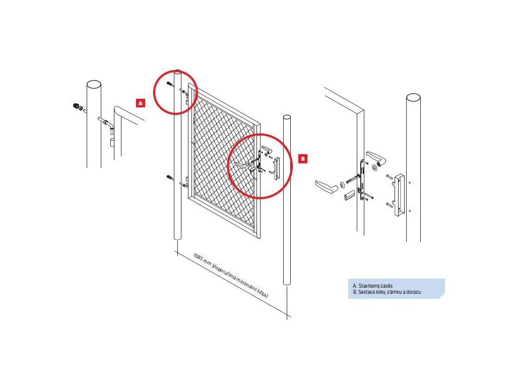 Plotová branka jednokřídlá IDEAL výplň čtyřhranné pletivo - 1085 (šířka na střed sloupků) x 1450 mm Pilecký.