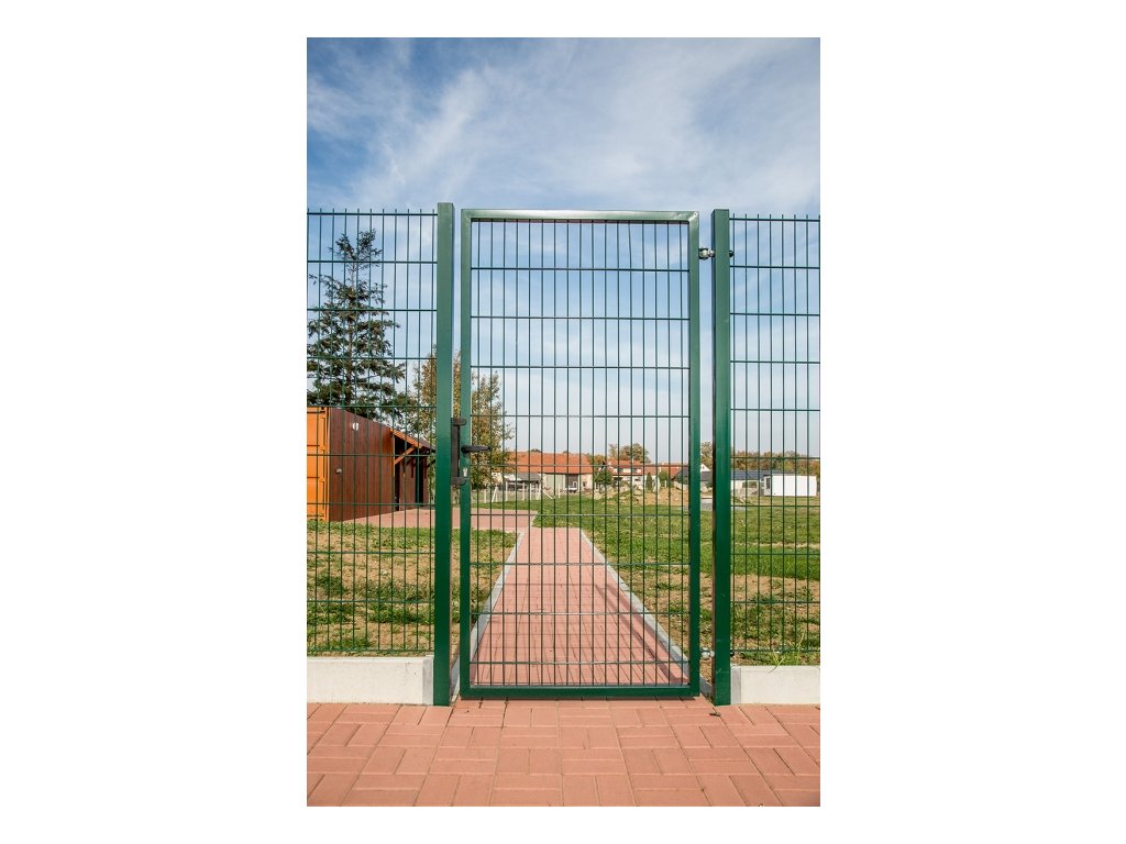 Plotová branka jednokřídlá PILOFOR Super výplň svařovaný panel bez prolisu - 1094 (šířka na střed sloupků) x 1380 mm se zámkem FAB Pilecký.