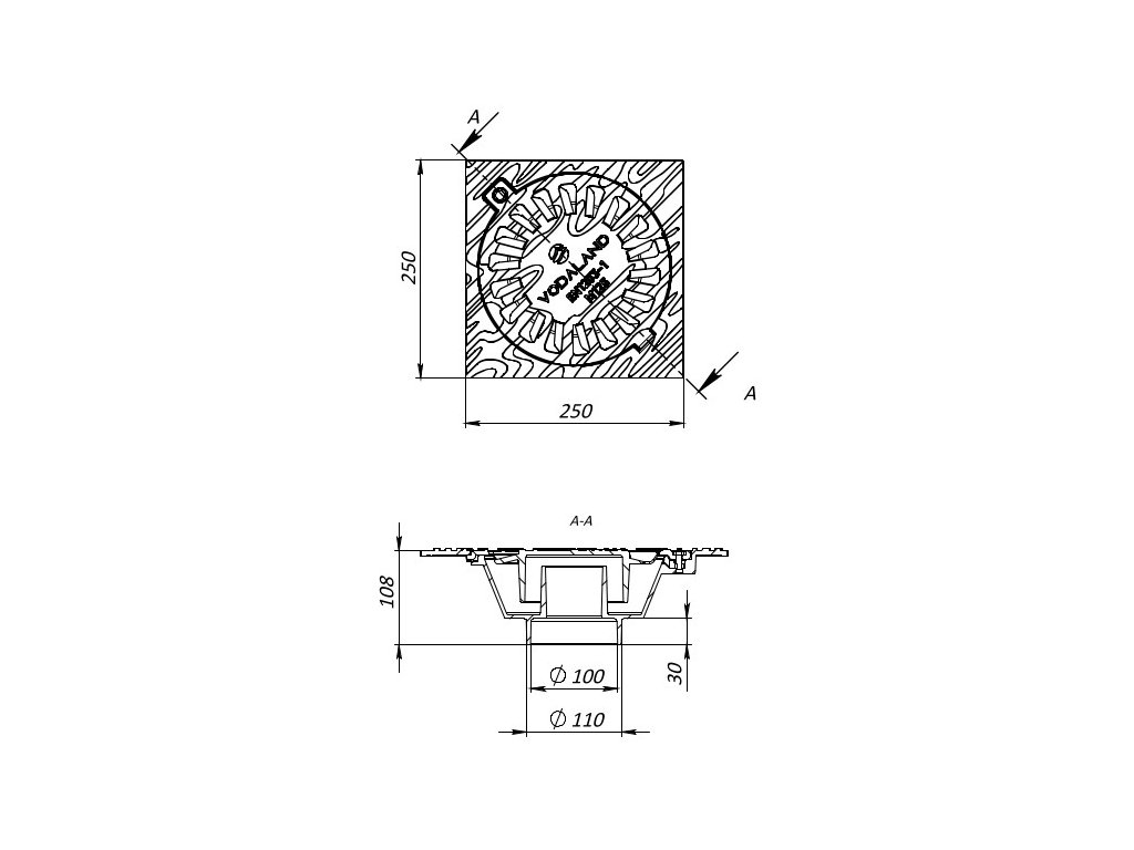 Kanalizační vpusť VODALAND M125 DN110 přímá litinová 250 x 250 mm černá