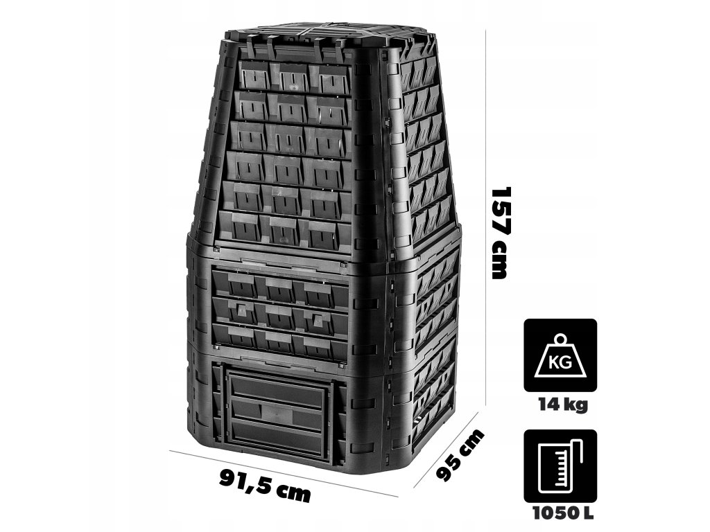 Kompostér EVOGREEN VARIO o objemu 1050 litrů je ideálním řešením pro každého, kdo hledá efektivní, ekologický a prostorově úsporný způsob, jak zpracovávat biologický odpad ze zahrady i domácnosti. Tento velkokapacitní kompostér je navržený tak, aby zvládl nároky větších zahrad. Je vyroben z kvalitního a odolného plastu, který je stabilizovaný proti UV záření a odolá jak letním horkům, tak zimním mrazům.