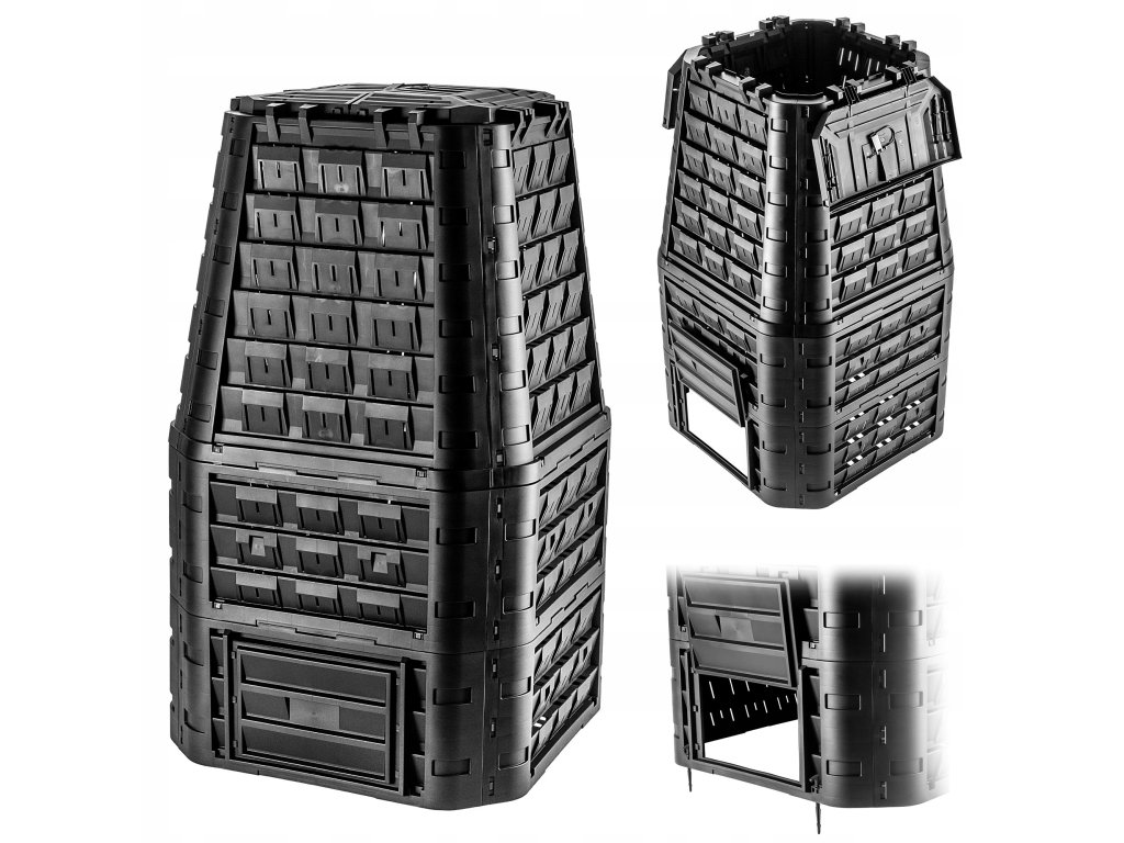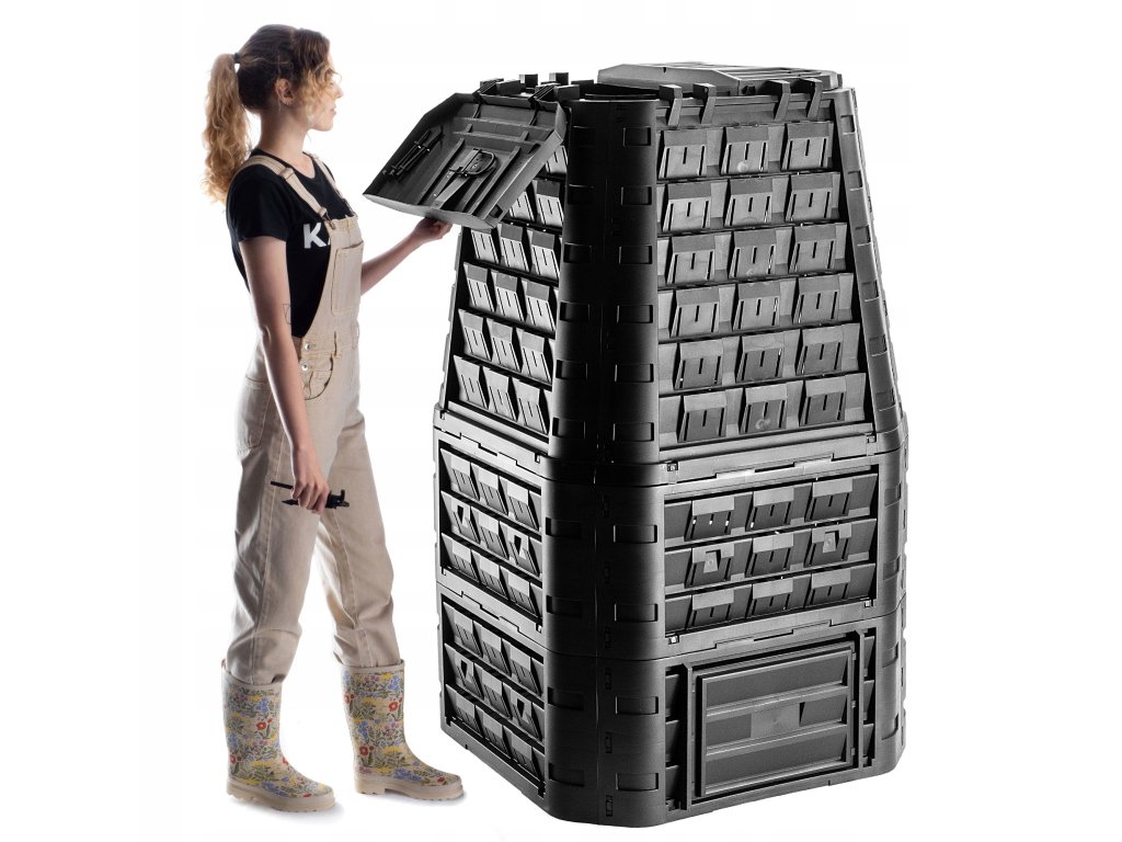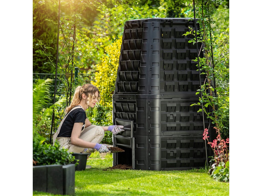 Díky jednoduché konstrukci je montáž velmi rychlá a nevyžaduje žádné nářadí – jednotlivé díly se jednoduše zacvaknou do sebe. Horní víko slouží pro snadné plnění kompostéru trávou, listím, kuchyňským odpadem nebo větvemi, zatímco spodní dvířka umožňují pohodlné vybírání hotového kompostu. Boční ventilační otvory zajišťují optimální cirkulaci vzduchu, což urychluje rozkladný proces a zabraňuje vzniku zápachu.