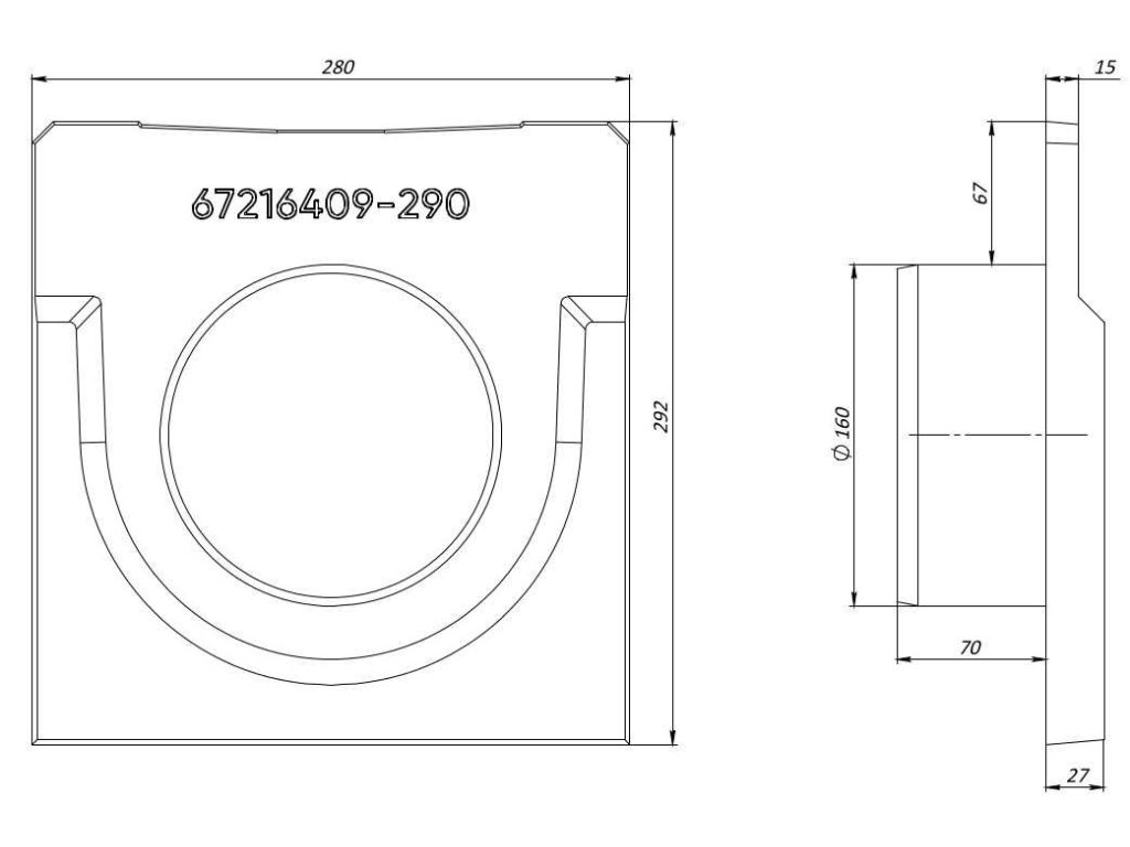 Tato koncovka je vyrobená z velmi odolného polymerbetonu a slouží jako doplněk pro zakrytí bočních otvorů odvodňovacího betonového žlabu VODALAND MONO s rozměrem 286 x 292 mm. Poskytuje vysokou odolnost proti zatížení i opotřebení, voděodolnost, mrazuvzdornost, snadnou instalaci a dlouhou životnost. Tento typ koncovky obsahuje odtok o vnějším průměru 160 mm.