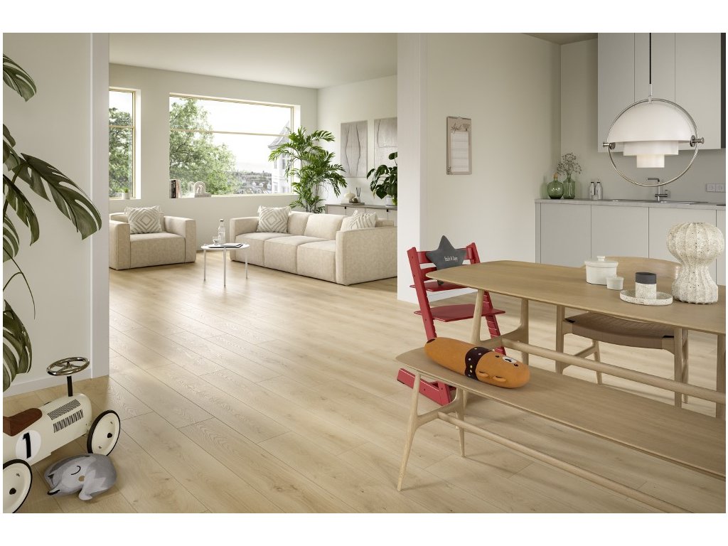 Dub Pinot pískový napodobuje vzhled skutečné dřevěné podlahy a dodává interiéru přirozený charakter. Jednoduchý vzhled v kombinaci se světle hnědou barvou vytváří dokonalou imitaci dubového dřeva.