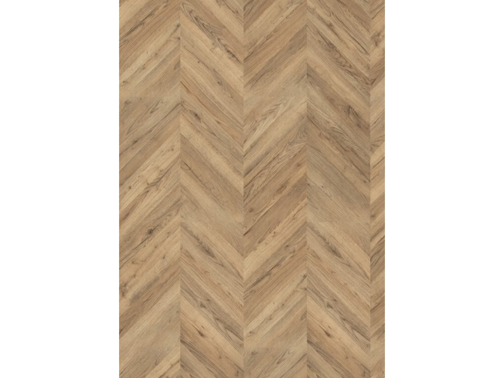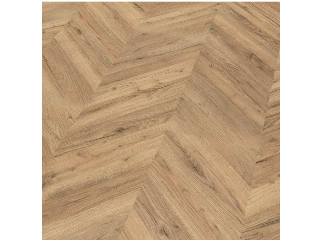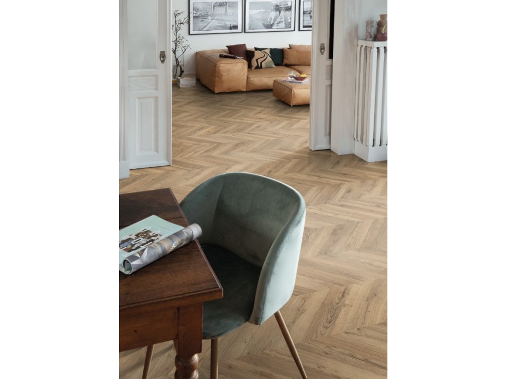Dub Rillington tmavý je dřevodekor rustikálního charakteru se vzorem rybí kosti na podlahové desce. Hnědý dekor má pestrou strukturu a díky elegantním prasklinám jej lze dobře kombinovat s černou.