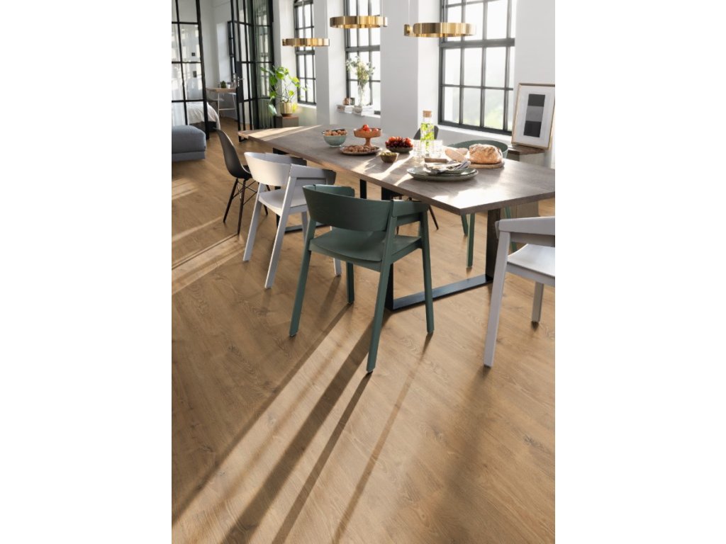 Dub Waltham přírodní má vzhled dřeva se suky a žilkováním v teplém hnědém odstínu. Obraz dekoru se suky podtrhuje rustikální charakter podlahy a je ideální pro přírodní styl bydlení.