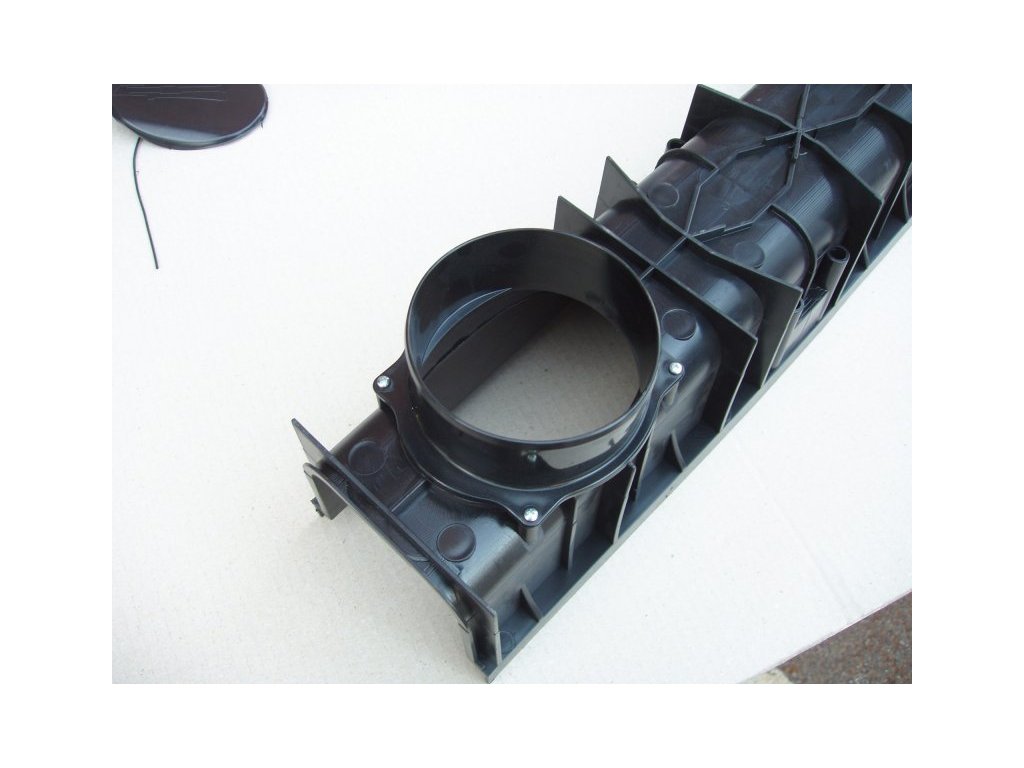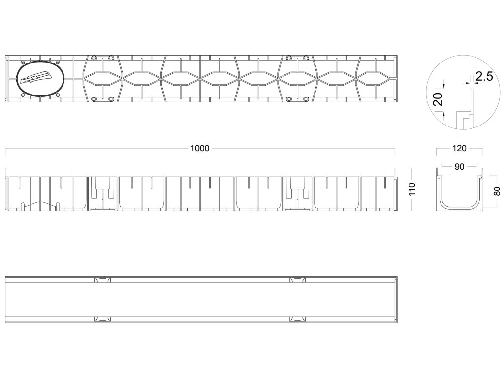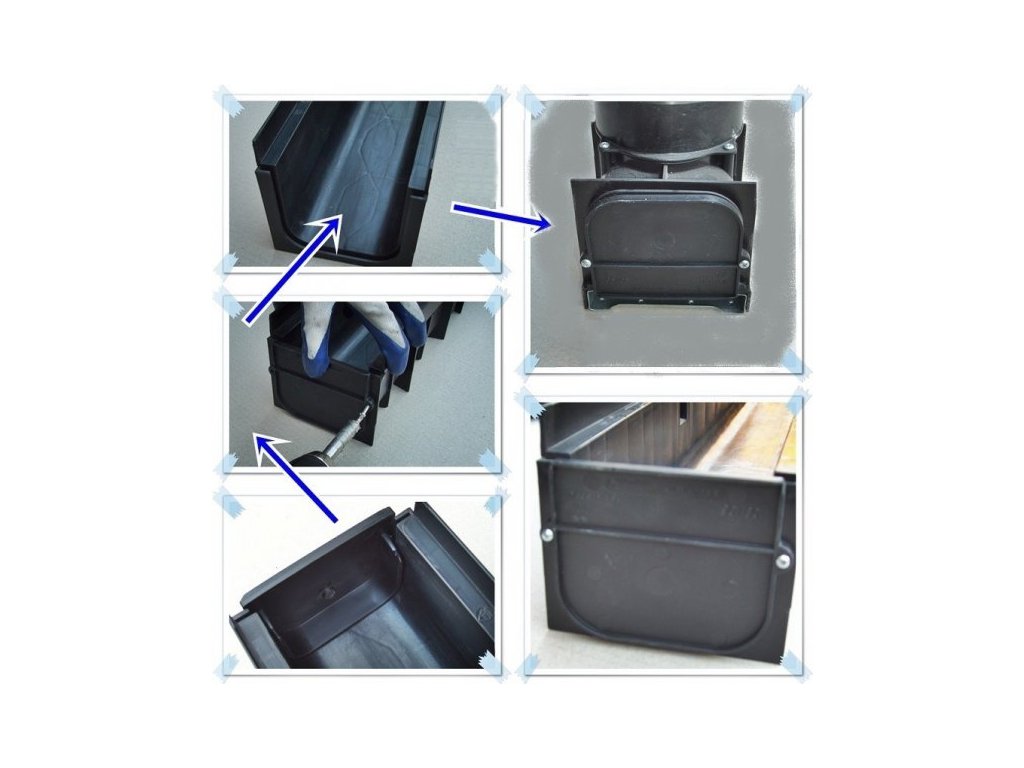 K tomuto typu žlabu lze instalovat přímo určenou koncovku, koncovku s odtokem, spodní odtok anebo speciální fixační sadu, která slouží pro ukotvení mříže.