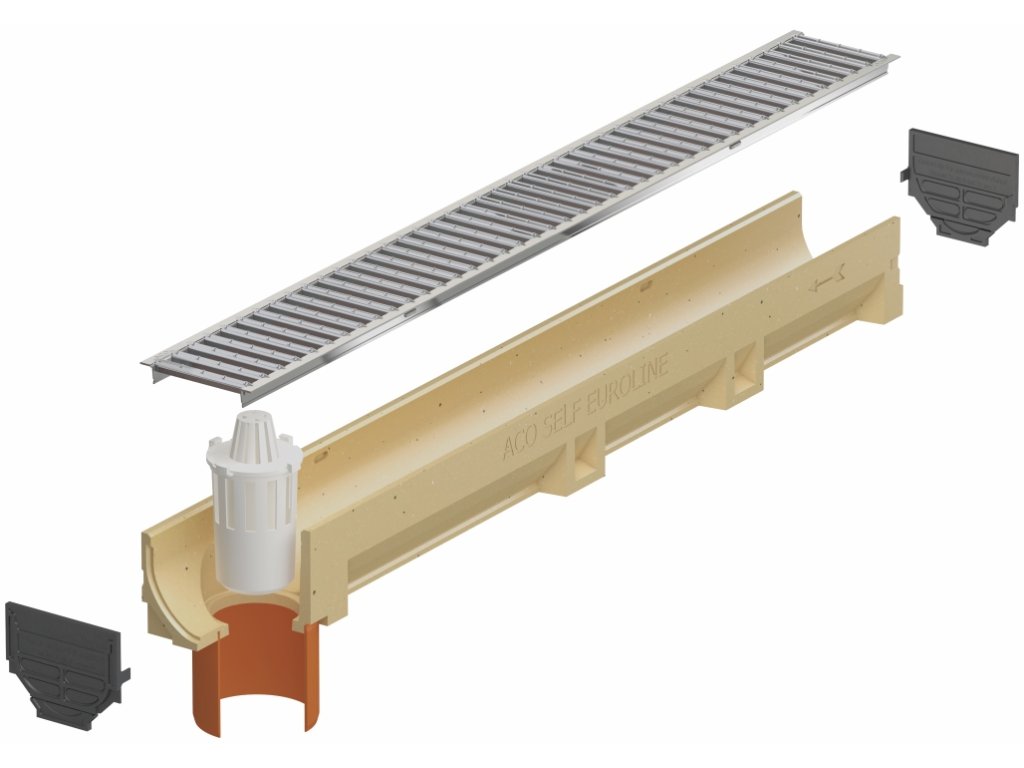 Odvodňovací polymerbetonový žlab ACO EUROSELF A15 je vyrobený z vysoce pevného a kvalitního polymerbetonu a slouží pro spolehlivý a účinný odvod povrchové vody z pěších zón, cyklostezek, chodníků, dvorků, teras a zahrad. Poskytuje vysokou odolnost proti zatížení a chemickým vlivům, vysokou pevnost a stabilitu, mrazuvzdornost, snadnou instalaci a dlouhou životnost. Zabraňuje samovolnému tvoření kaluží při vydatných deštích a jeho hladký povrch a V-profil zajišťuje vysokou rychlost proudění vody uvnitř žlabu i optimální samočistící účinek. Obsahuje plastovou mříž s bezšroubovou aretací, ochranné polymerbetonové hrany, výztužnou konstrukci bočních stěn zajišťující pevnost a stabilitu a také SF drážku pro 100% utěsnění. Tento typ žlabu nabízí jeden spodní odtok o vnějším průměru 110 mm, do kterého je možné instalovat přímo určený sifon.