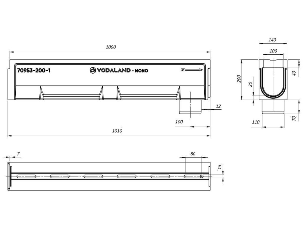 Odvodňovací polymerbetonový štěrbinový žlab VODALAND MONO C250 s odtokem 1000 x 140 x 200 mm