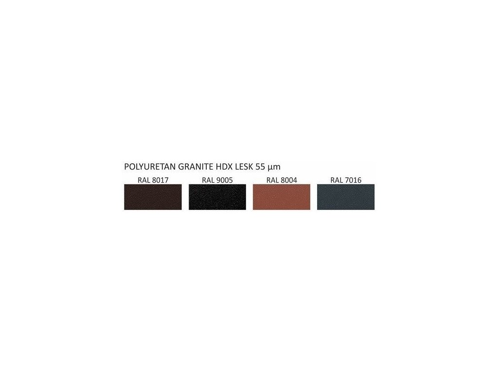 GRANITE HDX - tento polyuretanový potah je optimálním řešením pro venkovní použití v podmínkách, které vyžadují barevnou stabilitu a výjimečnou odolnost proti korozi a UV záření. Jmenovitá tloušťka je 55 μm. Tloušťka základní vrstvy je 12 μm. Silný kovový základ - zinek 275 g / m2, poskytuje odolnost proti korozi a zrnitý hrubý povrch zpevňuje povrchovou úpravu. Výrazná odolnost vůči mechanickým vlivům zajišťuje komfort práce během přepravy a zpracování. Granite HDX je řešení určené pro použití v agresivním a náročném prostředí: studené a vlhké prostředí, pobřežní oblasti (do vzdálenosti 20 km od pobřeží), slunečné oblasti s vysokým stupněm UV záření, průmyslové a znečištěné oblasti.