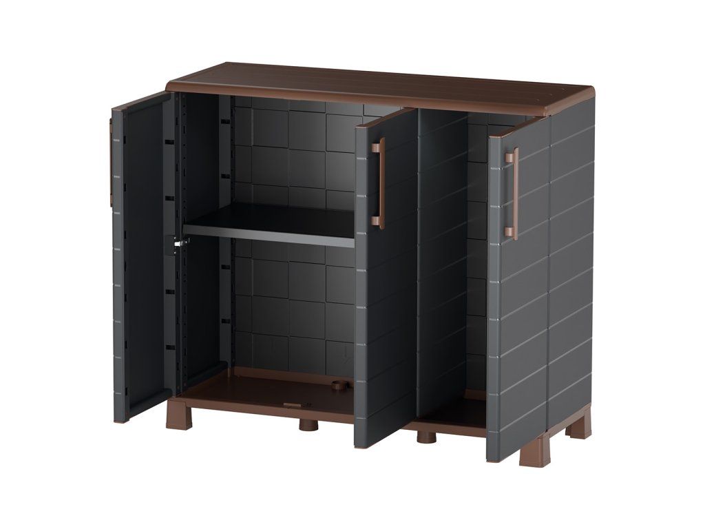 Uvnitř se nachází praktická police s nosností až 20 kg, která umožňuje bezpečné uložení nářadí, zahradního vybavení, čistících prostředků nebo dalších potřeb. Díky třem samostatným dvířkům je přístup k uloženým věcem snadný a přehledný.