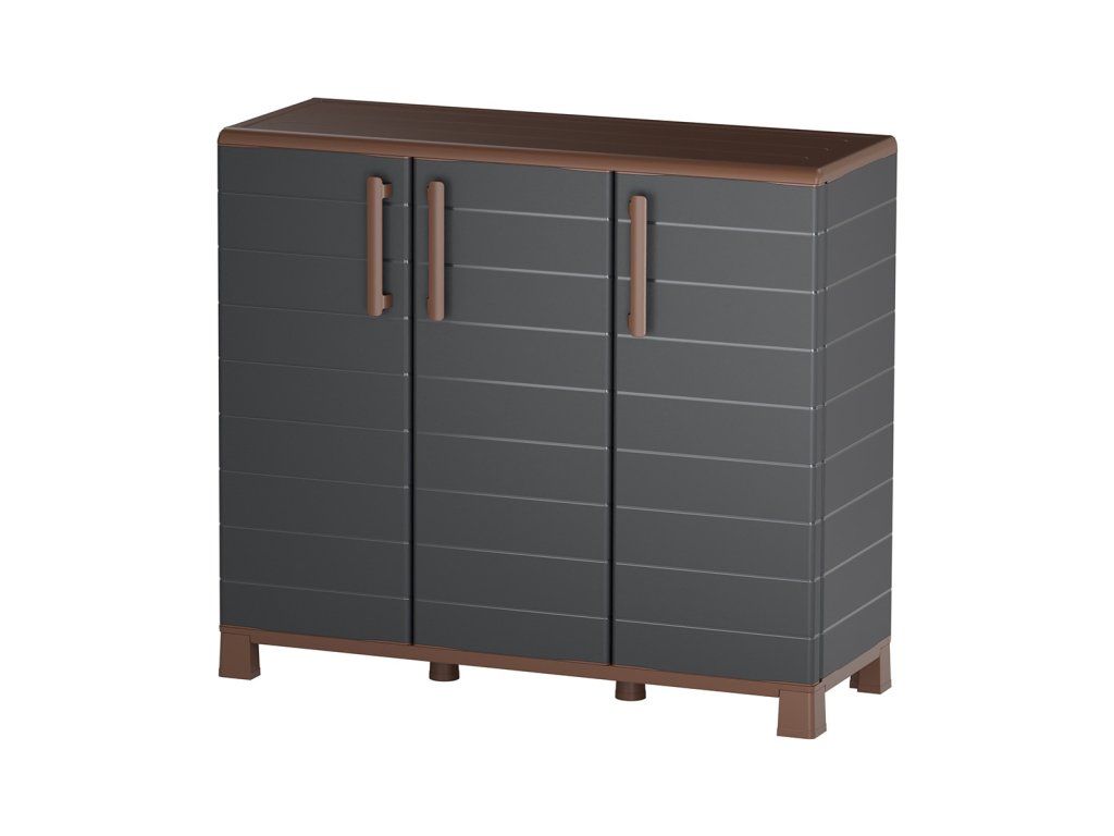 Moderní design v kombinaci antracitové a hnědé barvy zapadne do každého prostředí a díky nízké konstrukci lze skříň využít i jako odkládací plochu.