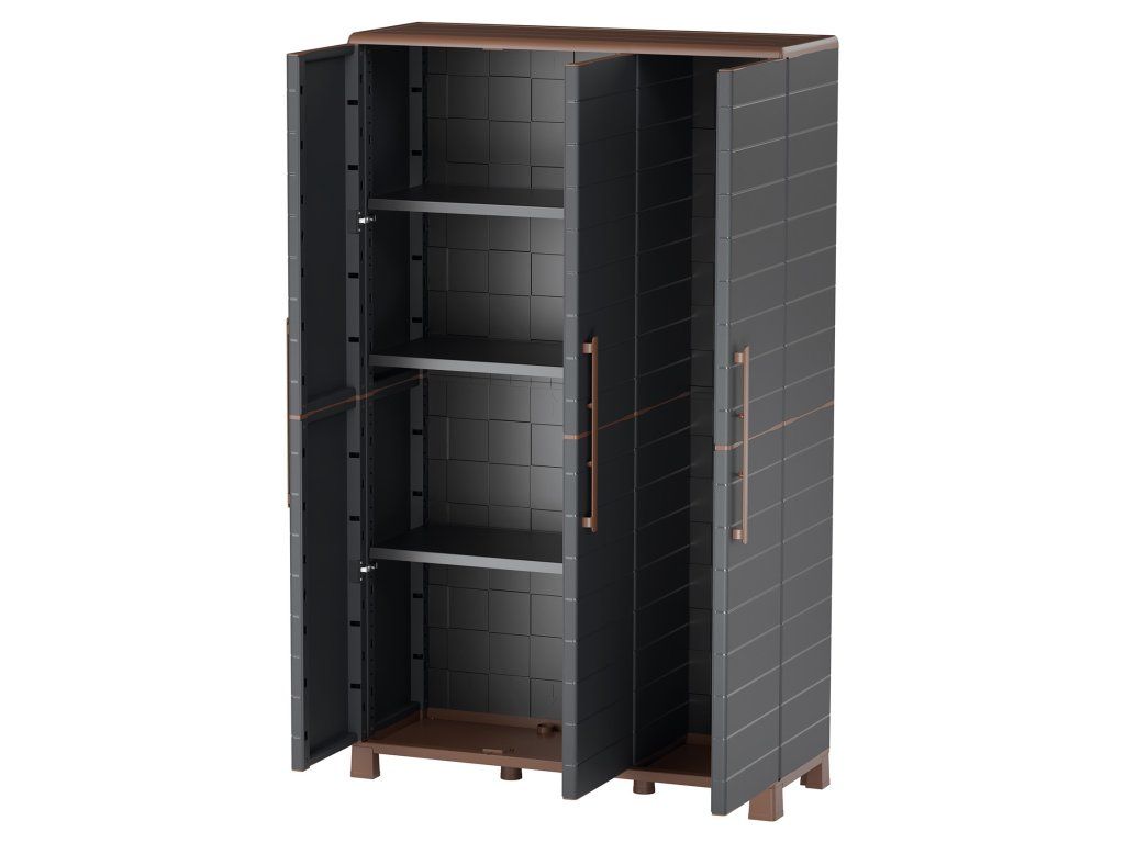 Skříň je vyrobena z kvalitního recyklovaného polypropylenu, který je odolný vůči vlhkosti, snadno se udržuje a nedegraduje ani při dlouhodobém používání. Je tak vhodná nejen do interiéru, ale i do náročnějších prostor, jako jsou garáže, sklepy, technické místnosti nebo kryté venkovní prostory.