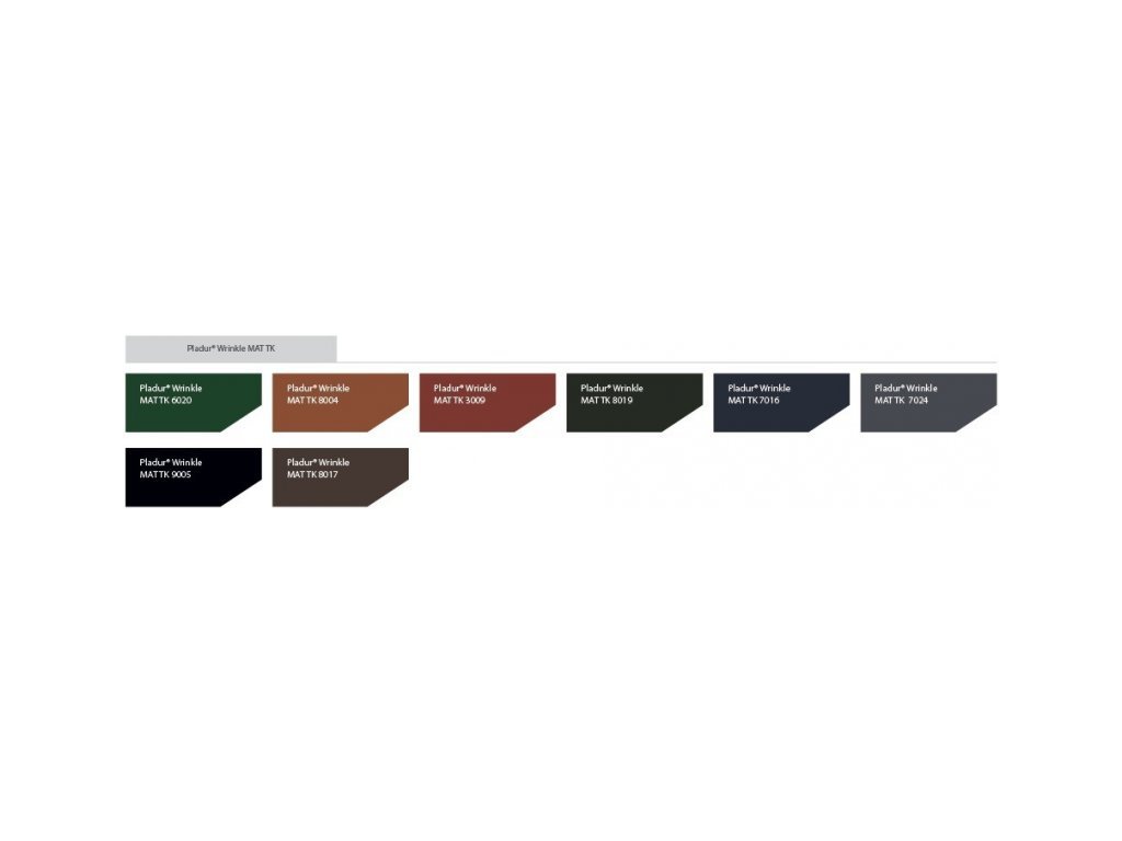 Pladur RAL Premium s ocelovým jádrem a vysoce kvalitním dekoračním lakem, tloušťka povrchové úpravy minimálně 35 mikronů. Plech dle rozhodnutí komise 96/603/EC splňuje požadavky třídy A2 protipožární ochrany a může být použitý v třídě koroze C4, v souladu s normou EN ISO 12944-2. |