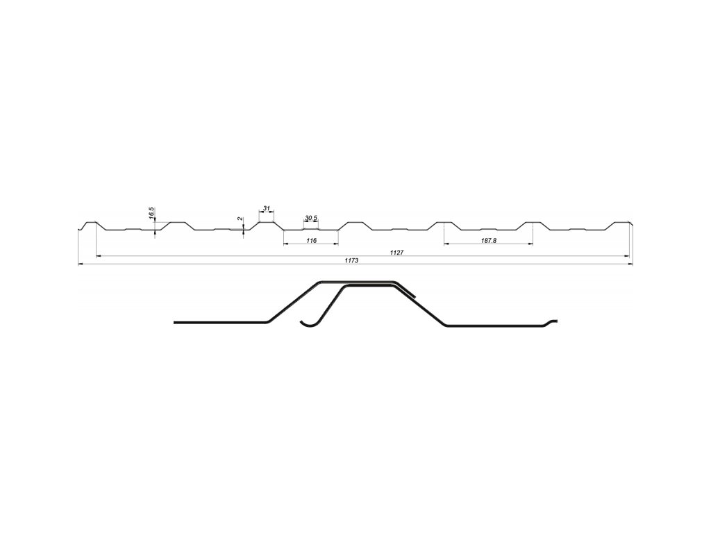 Sklon střechy: minimálně 9° Celková šířka: ∼ 1173 mm Efektivní šířka: 1127 mm Tloušťka: 0,5 mm Výška profilu: 16,5 mm Délka vlny: 187,8 mm Délka tabule: max. 12000 mm Hmotnost: ∼ 4,5 kg / m2 |