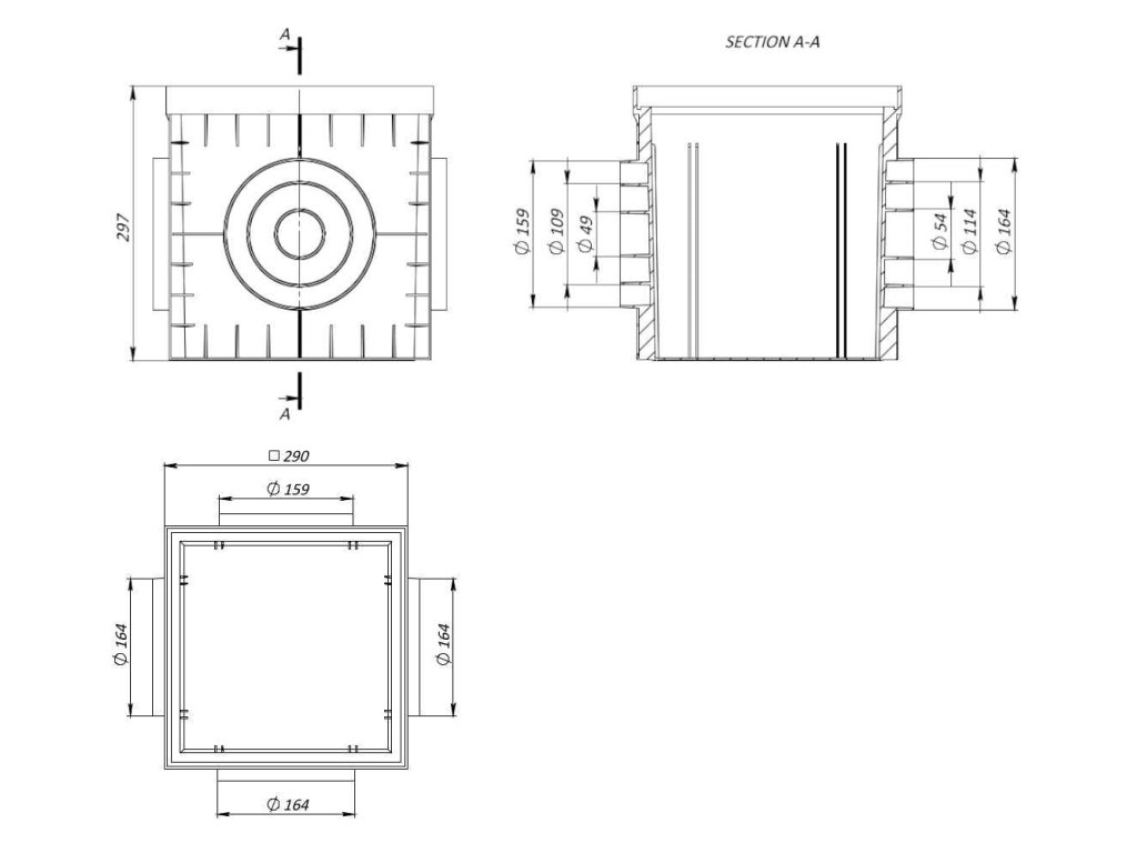- vnější průměr vtoků/odtoků: 50 mm, 110 mm, 160 mm