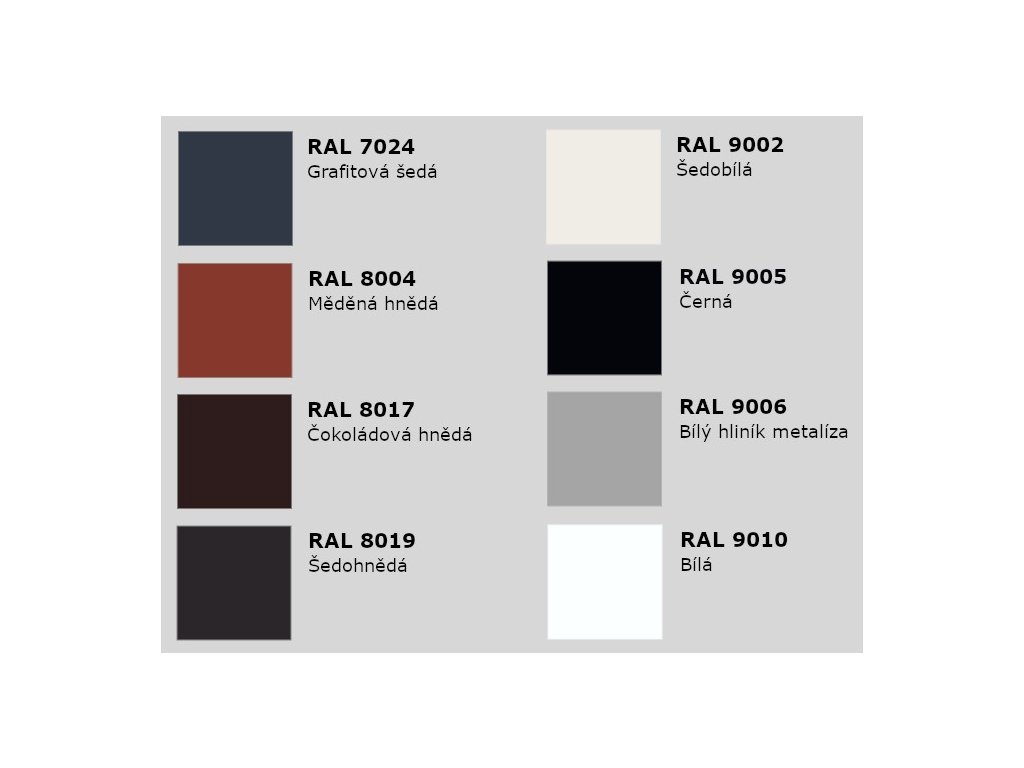 Za příplatek možnost dodání v různých odstínech RAL - může se stát, že Vámi požadovaný odstín nebude aktuálně skladem - v tomto případě bude dodací lhůta do cca týdne.
