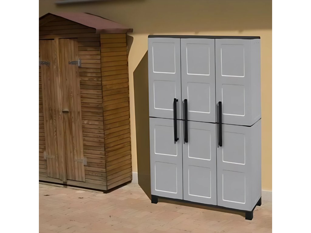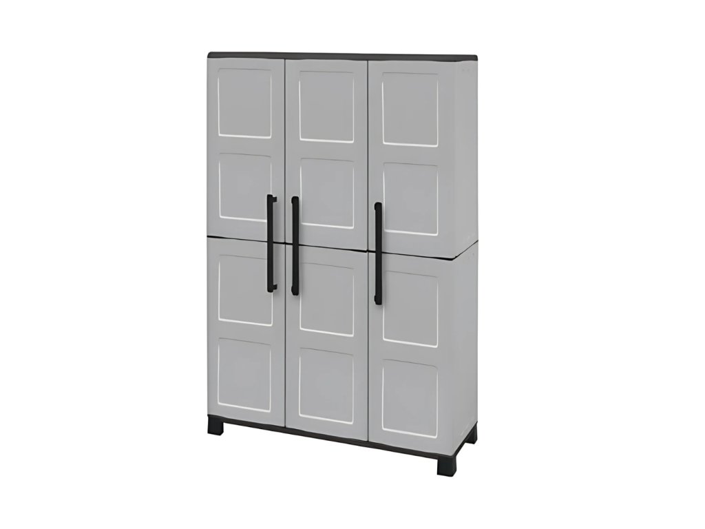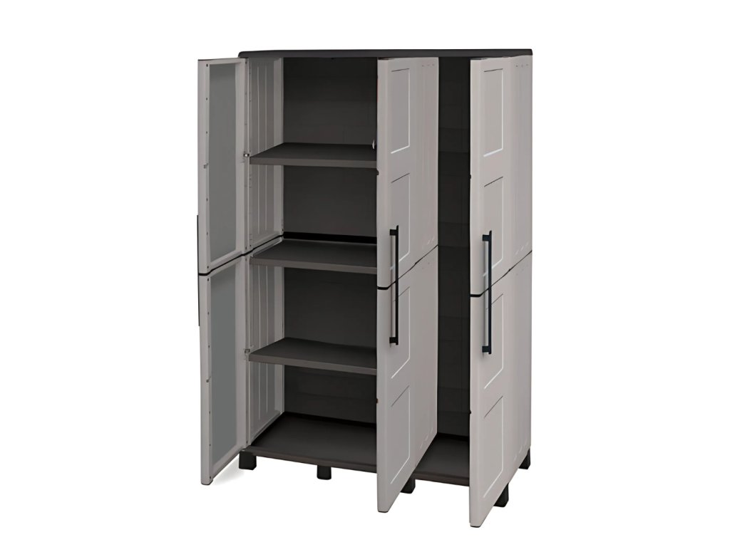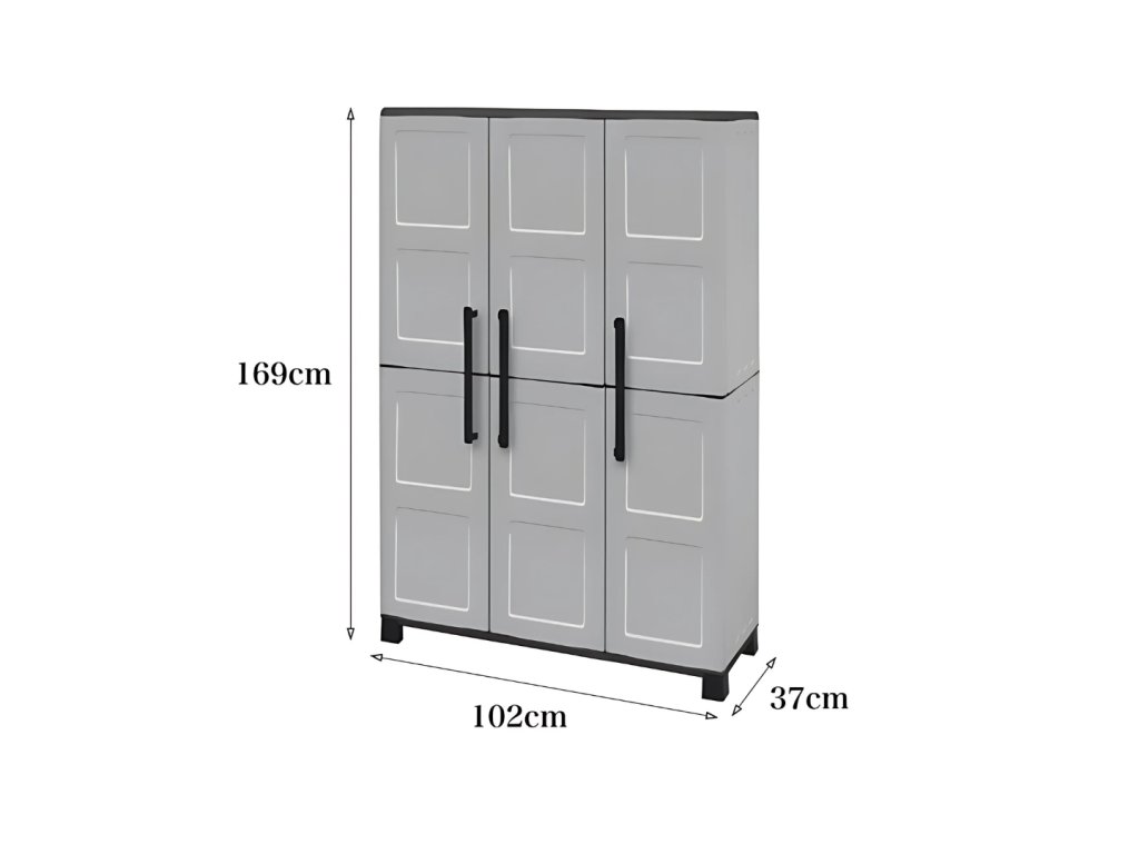 Kvalitní plastový materiál zajišťuje odolnost vůči vlhkosti, UV záření i běžnému opotřebení, takže skříň skvěle poslouží v interiéru i v krytých venkovních prostorech. Troje dvířka umožňují snadný přístup ke všem uloženým věcem, zatímco zvýšené nožky usnadňují úklid pod skříní.