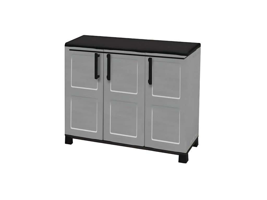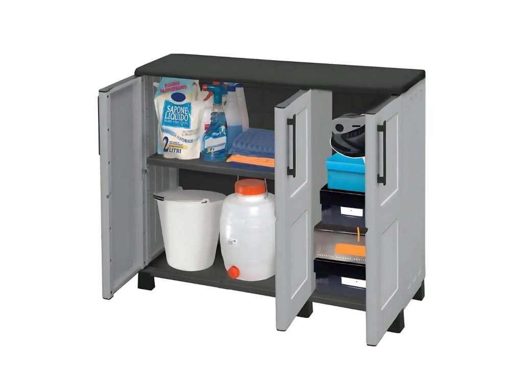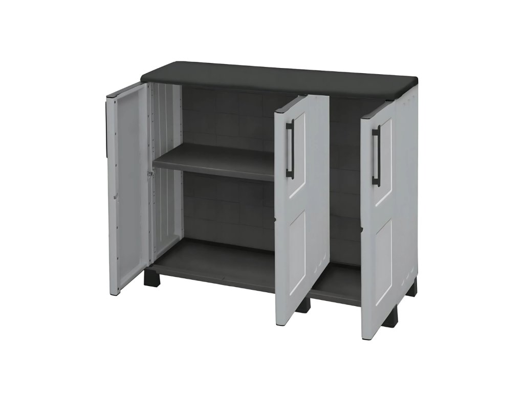 Nízká plastová skříň Linea Idea o rozměrech 1020 x 370 x 900 mm je ideální pro každého, kdo potřebuje kompaktní, ale prostorné úložiště. Díky třem dvířkům a dvěma nastavitelným policím poskytuje přehledné členění a dostatek místa na nářadí, čisticí prostředky nebo domácí potřeby.