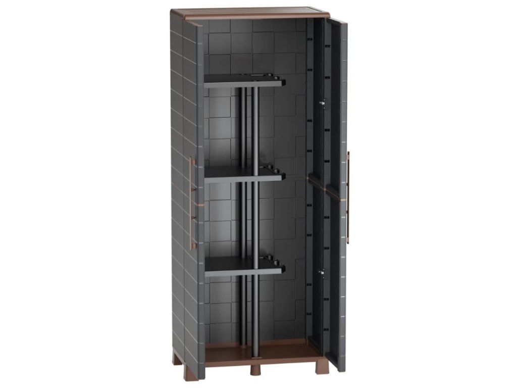Skříň je vyrobena z kvalitního polypropylenu, který neabsorbuje vlhkost ani pachy, je odolný vůči běžnému opotřebení a nevyžaduje žádnou náročnou údržbu. Díky tomu je ideální do garáže, sklepa, technické místnosti, prádelny nebo na kryté venkovní prostory.