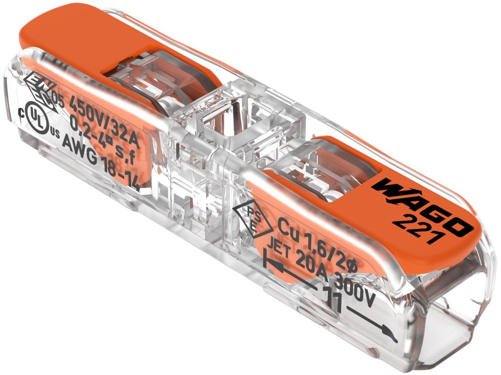 Krabicová bezšroubová spojovací svorka WAGO INLINE je určená pro instalaci všech druhů vodičů o průřezu 0,2 - 4 mm². Obsahuje 2 svěrná místa a páčku, pomocí nichž lze připojit jemně laněné nebo plné vodiče o průřezu 0,2 - 4 mm² a vícedrátové vodiče o průřezu 0,2 - 2,5 mm². Díky částečně průhlednému provedení lze kontrolovat spoje a polohu vodiče. Tato svorka je konstruována pro jmenovité napětí 450 V a jmenovitý proud 32 A s trvalou teplotou pro provoz od -60 až do +105 °C.