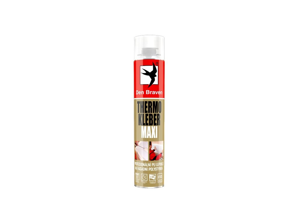 Lepidlo nízkoexpanzní polyuretanová pěna na polystyren THERMO KLEBER MAXI je speciálně vyvinuté pro požadavek vysoce efektivního lepení lehkých izolačních materiálů a dekorativních prvků z polystyrenu na svislé konstrukce. Výborné při tvorbě tepelného štítu, (zdivo-PUR-EPS). Výsledná pěna má výbornou strukturu i při +5 °C. Vyniká velmi vysokou výtěžností.
